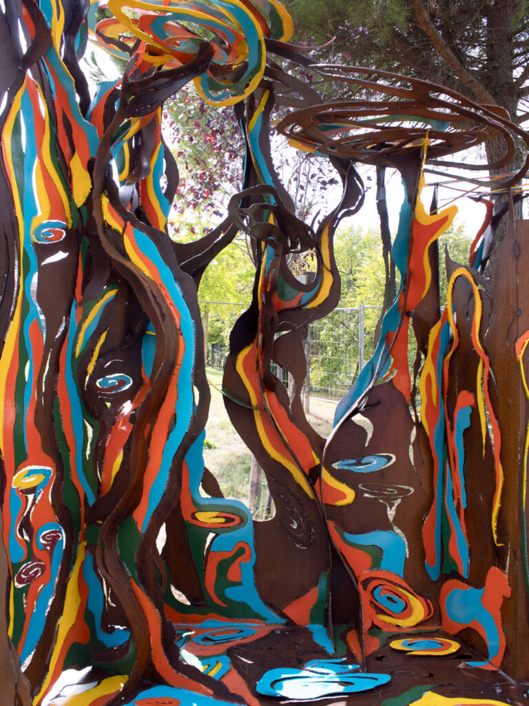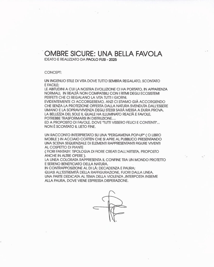 Una “pergamena pop-up” in acciaio corten che racconta la fragilità dell’equilibrio tra uomo e natura, tra protezione e decadenza.