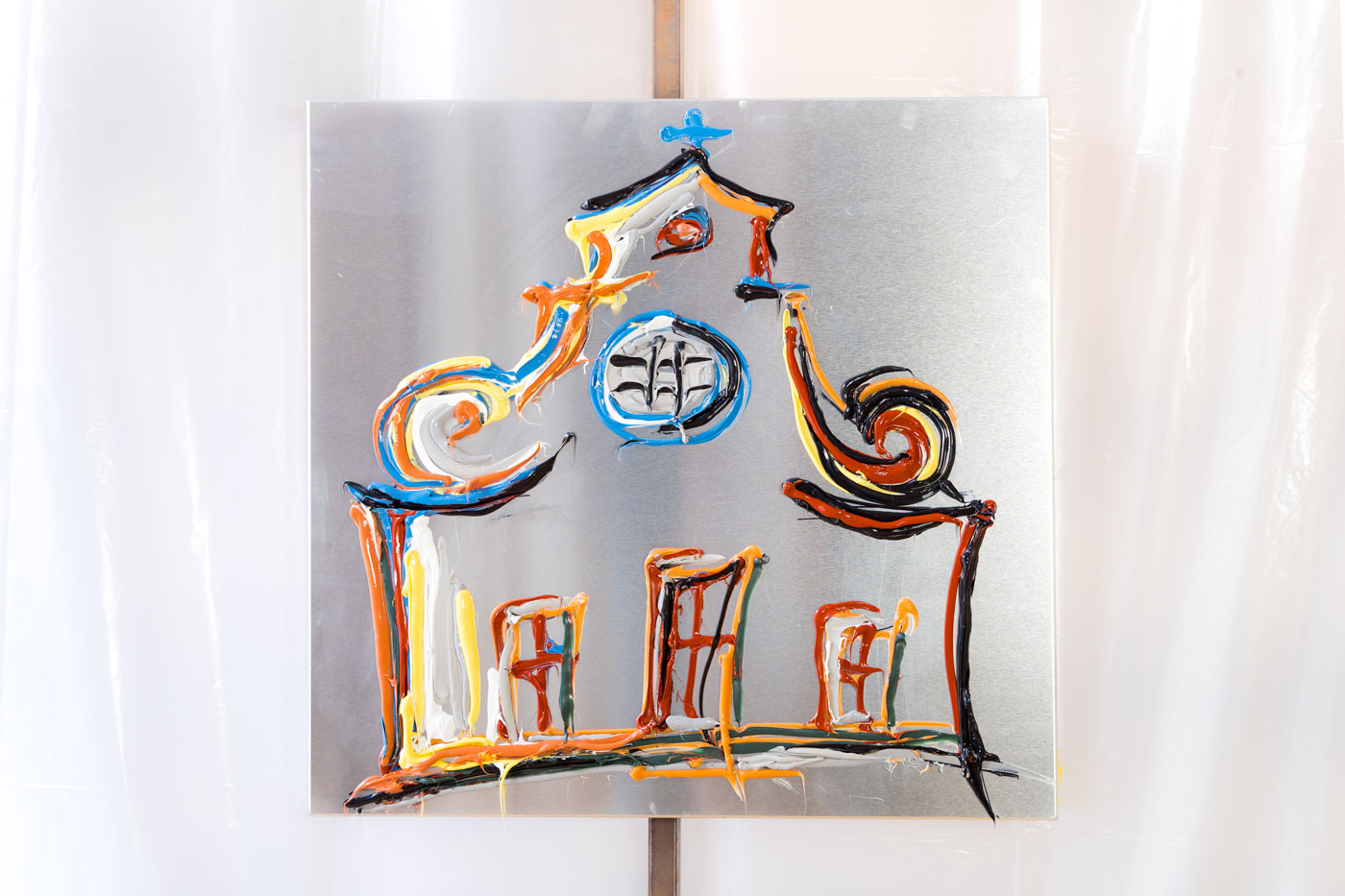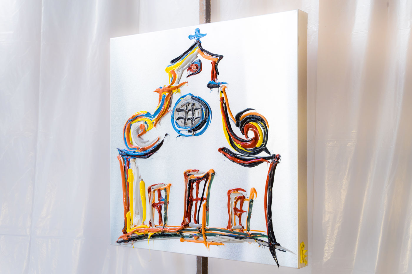 “Santo Spirito” fa parte della Serie Firenze e reimmagina la celebre basilica con un linguaggio contemporaneo, dove il silicone applicato su alluminio dà vita a giochi di luce, profondità e movimento. La superficie vibrante e le colature materiche trasformano la facciata in un segno attuale, che dialoga con la storia e la spiritualità del luogo.