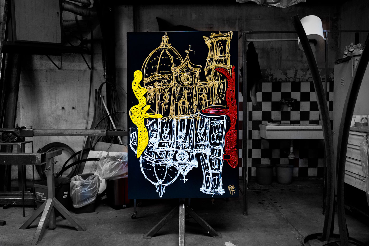 “Serie Firenze, Toys” reinterpreta il panorama monumentale della città inserendo, tra i suoi simboli più noti, dei toys erotici allusivi. Il silicone modellato su alluminio crea una superficie vibrante, dove la classicità dei monumenti dialoga ironicamente con la contemporaneità del desiderio e dell’allusione.